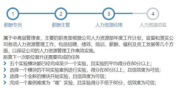系统根据学生实验完成的进度和得分,赋予相应的职称,给学生“升职”,让学生时刻了解自己的技能掌握情况,激励学生学习的主动性。