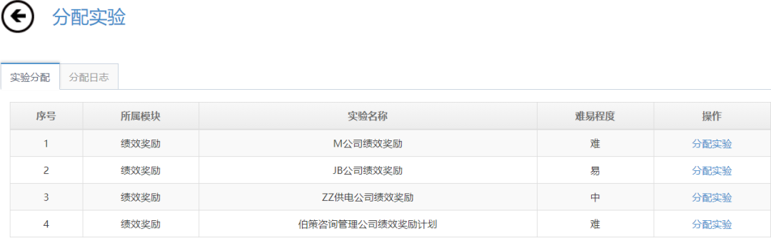 案例难易程度分层设置,方便老师根据授课进度分配实验,帮助学生循序渐进学习薪酬管理知识。