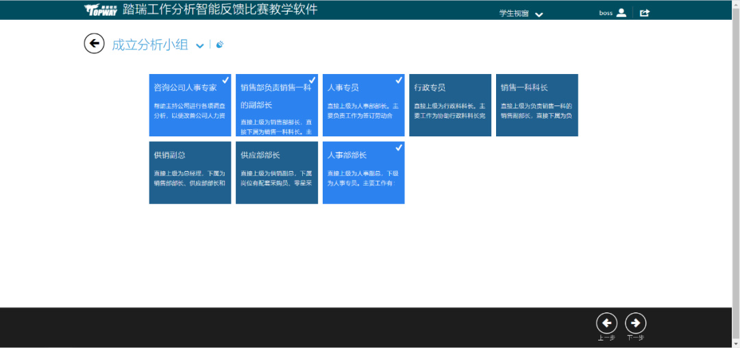 踏瑞工作分析智能反馈比赛教学软件,包括工作分析的一般过程、问卷法、任务清单法、关键事件法、胜任力素质模型和工作说明书编制等内容。在每一具体的实验流程中,软件时刻秉承“所见即所得”的指导思想,在具体内容上积极探索情景模拟再现和多样化的参与方式,在视频、选择和问答等传统形式的基础上探索了使用拖曳、flash和判断等的新形式。